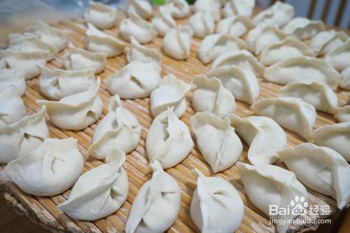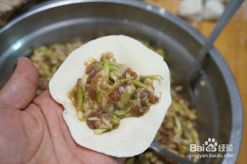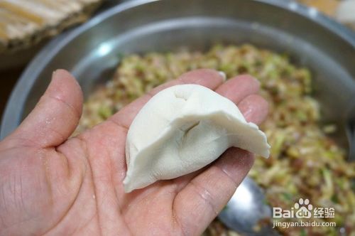 取适量馅放在圆皮上,用自己的手法或包或挤成饺子。