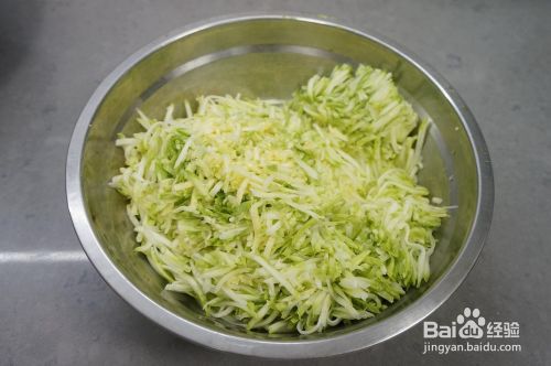 西葫芦用擦丝器擦细丝,尽可能横着擦,这样就不会太长。