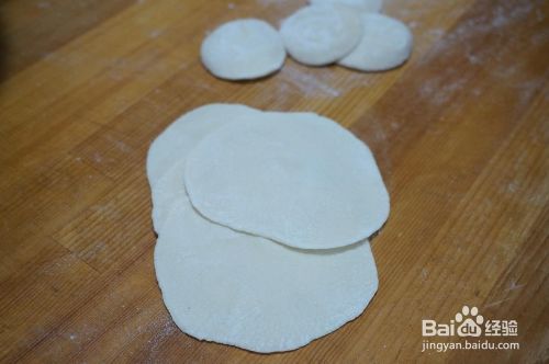 饧好的面团放在案板上揉一揉,搓成长条,分成大小均匀的剂子,擀成中间稍厚、边缘略薄的小圆皮。