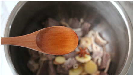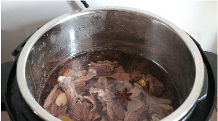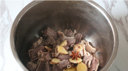 牛腩洗去浮沫,加入电压力煲,再加入姜片,八角。