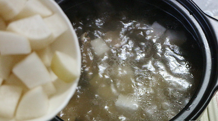 汤煲好后倒入汤锅,烧开后加入萝卜丁