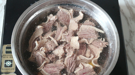 牛腩冷水下锅,加入几片姜片,料酒,烧开后煮出血水