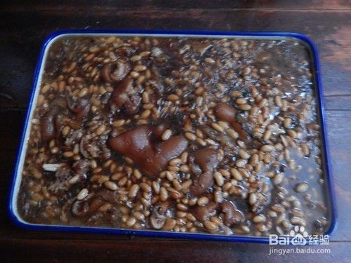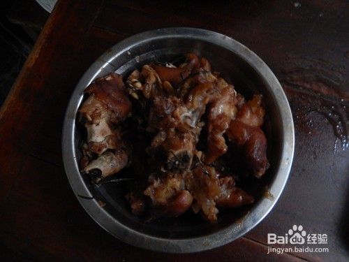 剩下蹄筋和肉和锅里的汤倒进大盆里。