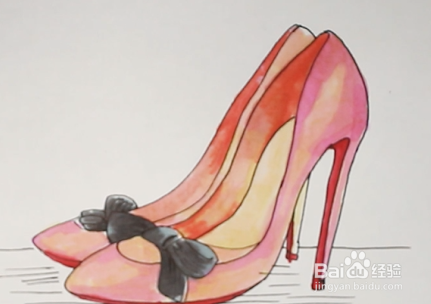 接着用色涂边缘部分,蝴蝶结涂灰色,再用黑色加深,再用橙色灰色加深鞋内,粉色红色再叠加,接着用红色灰色土黄叠加;