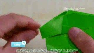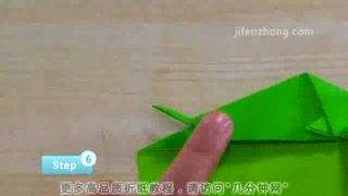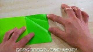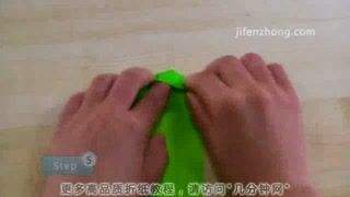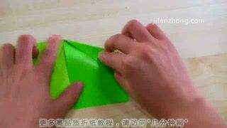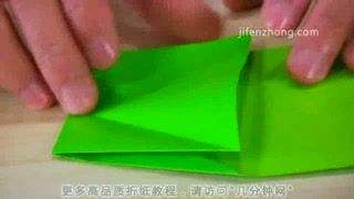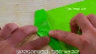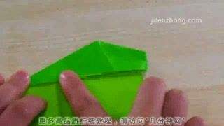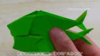 5将头部里面一片拉出来,压平,再向右折1/3,然后把下面多出来的角向左上方折,最后把它向右推,藏入中间层,就得到了鱼儿的胸鳍。