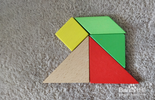 在平行四边形的上面,放上黄色三角形挨着,如图。这样就拼组好了。