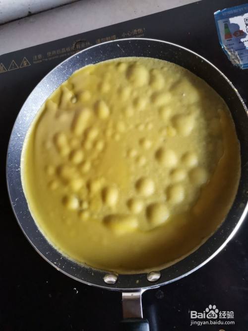 平底锅刷少许油,开小火倒入班戟液,一直小火看到班戟皮起泡泡即可