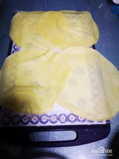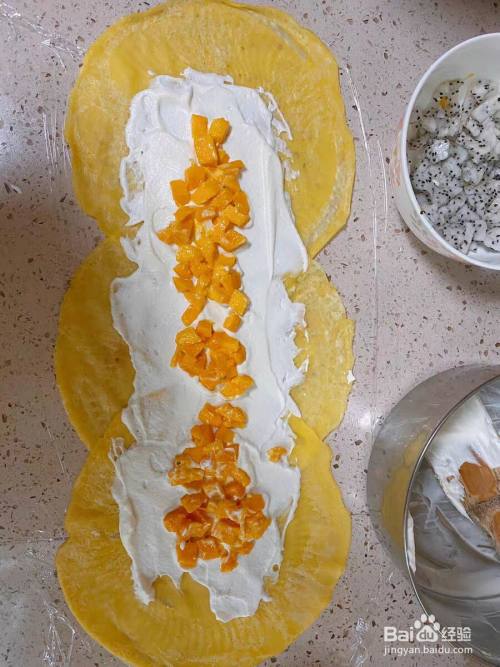 如图摊开班戟皮,将奶油均匀涂抹,不要太多,不然不好包,放上芒果丁即可