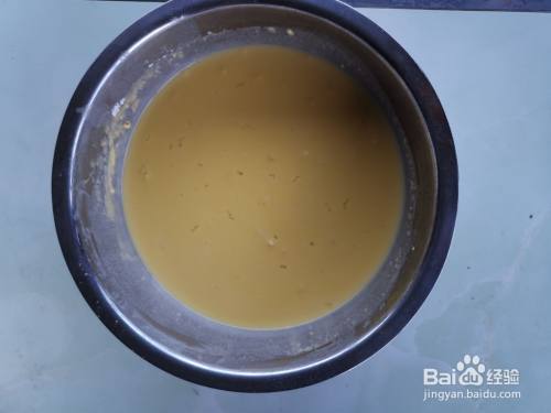 将准备好的班戟预拌粉,110ml纯牛奶,鸡蛋,植物油,凉白开倒入打蛋盆中,用打蛋器打至均匀无颗粒状就可以