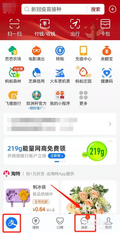 我们进入了支付宝的 首页,点击页面右下角的 消息