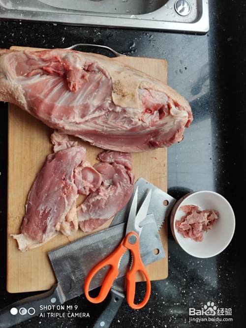 今天做爆炒鹅胸肉:解剖鹅,剪刀用上,今天我用鹅胸肉,鹅皮不要哦,剪下来的鹅肉切小块!