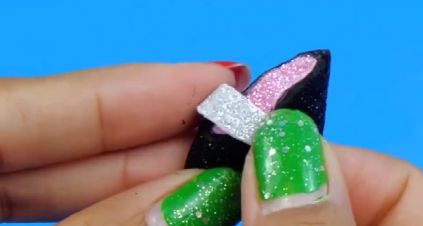 用海绵纸包围粘贴,再用剪刀剪掉多余部分,在上方贴上细条亮片海绵纸,芭比超级好看的凉鞋就做好了