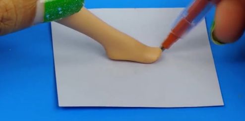 取一块纸板,按照芭比脚的大小画出形状,然后剪刀裁剪下来,粘上一层亮片海绵纸,用力按压出来形状