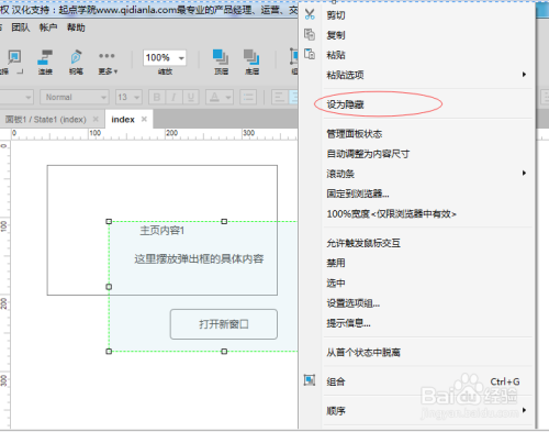 在上述步骤过后,主页index的页面效果将如下所示,鼠标右键点击动态面板,把动态面板设置成隐藏,具体操作如下截图2。