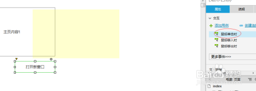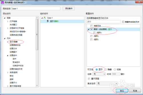 为页面上的按钮增加事件。选中按钮,在右边的设置面板中,双击“鼠标单击时”按键,如下截图1,页面将会弹出新的用例编辑窗口,选择元件的“显示/隐藏”,找到刚刚的动态面板,并将其设置为显示,具体操作如下截图2中标红的位置。这步的设置非常重要, 只有正确设置了这步,才能正确的弹出窗口。