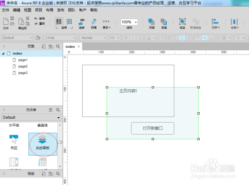 从左边元件库中拉出一个动态面板,放在页面上,摆放位置可以根据需要进行摆放,也可以通过设置,使其在页面上居中显示,具体这个设置步骤请查看步骤十说明。