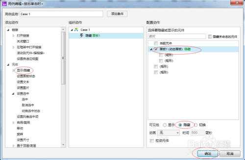 在第五步中增加的动态面板,也有放置一个按钮,该按钮的作用就是点击后自动关闭弹出框,设置步骤和步骤7类似,只是将“显示”改成了“隐藏”,具体操作如下截图中标红的位置。