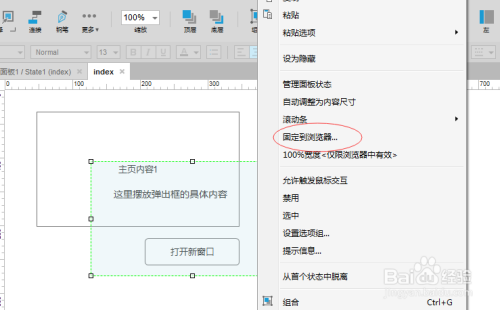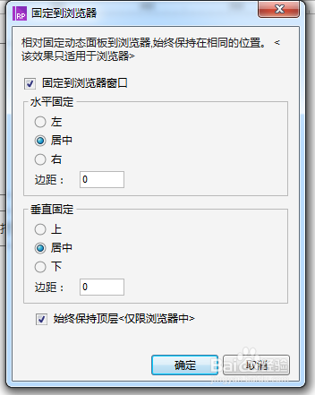 在主页上,鼠标右键点击动态面板,在弹出的选择项中选择“固定到浏览器”并单击它。在弹出的对话框中按照如下截图2进行配置就可以了。