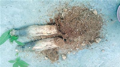 将生病的树桩拔出,将变黑的根须除掉。将发黑的根皮除掉,保留鲜活的根须。