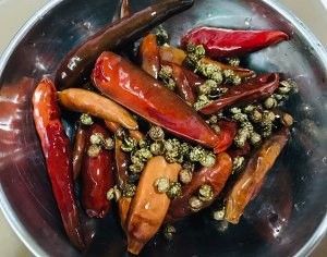 锅内加入适量菜油(平常炒菜的量)烧热,然后关火下去干辣椒和花椒爆香立即捞出。