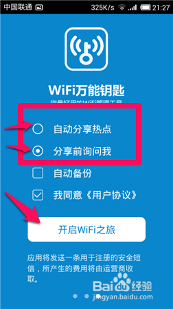 进入时候,设置好是否允许自动分享自己的WIFI热点,然后进入。