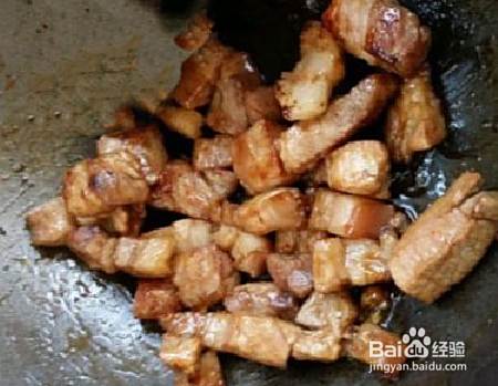 第二步:锅里放清油少许,放入蒜瓣爆香,放入五花肉炼出部分猪油,倒入干炒过的长豆角。