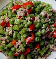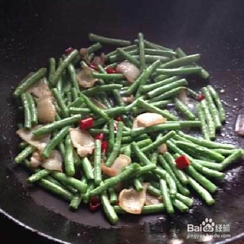 放油烧热,入大蒜瓣煸香,入生姜丝,放青椒丝,再入长豆角翻炒,炒到豆角有些发软了,放盐调味,放生抽调色出锅。