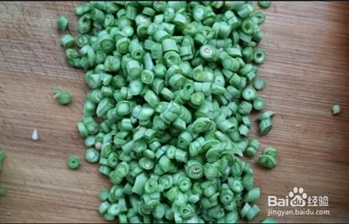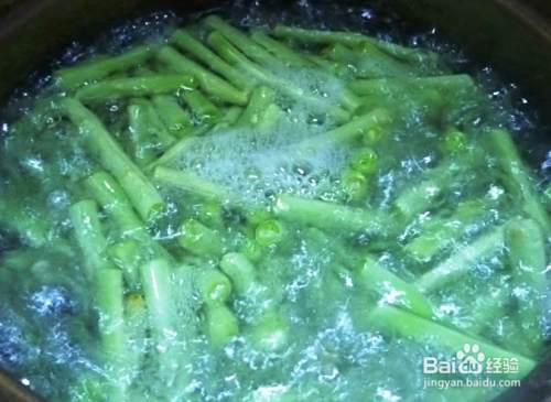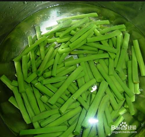 首先:长豆角用手折成断,烧开水一锅,倒入开水中,直到水重新开了,捞出,赶紧过凉水凉透。