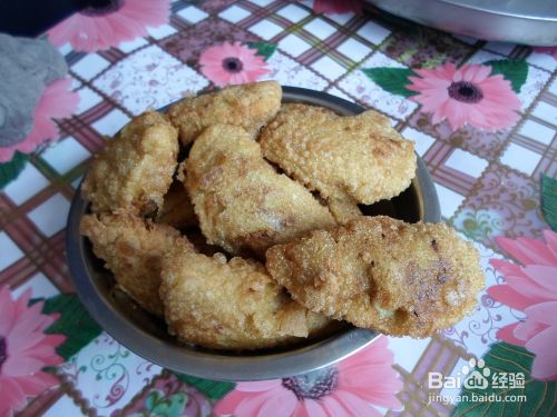 把铁锅放在火上加热,倒入大约500克的食用油(需要说明的是油一定要多倒些,这样炸出来的糕比较脆),当油熟透之后就可以把捏好的糕放到油里炸了。请看,金黄金黄的油炸糕是多么诱人呀!