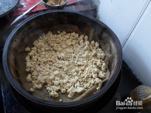 把蒸笼放在开了水的蒸锅上,垫上一层笼布以防止糕面从笼屉的小孔里掉到水里,然后将和好的糕面一层一层地洒到笼屉里。