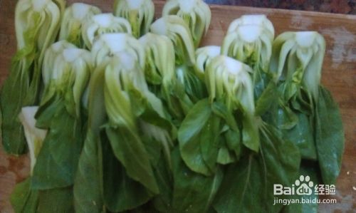 把小棠菜洗干净,然后用盐水浸泡30分钟,跟着就可以把小棠菜改刀,一分为二。