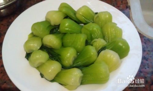 当锅内的水大滚后把小棠菜放入焯烫成熟。