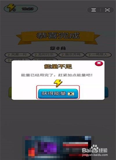 连续玩几关后,就会显示【能量不足】,可以点【获得能量】,开始观看小视频,视频看完之后,点右上角的【关闭广告】。