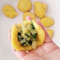 8. 趁糕剂子热乎用两手把它做薄皮状,包入馅料成饺子状。