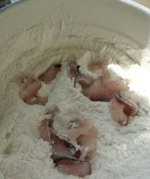 锅中烧热油,将鱼片分次放入混合好的粉中,均匀裹上干粉。