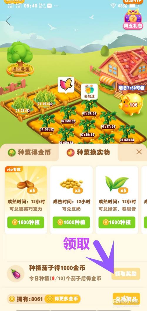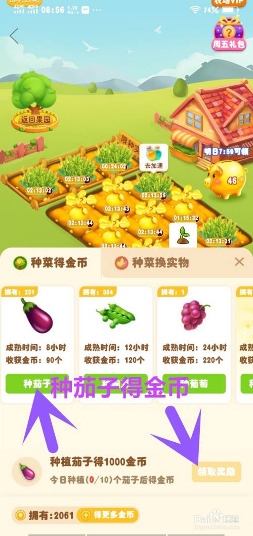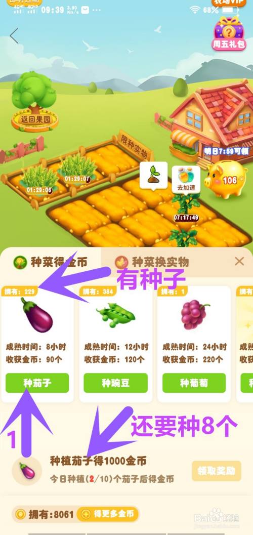 茄子还需要种8个才能得金币,如果有茄子直接点击种茄子,如果没有也点击种茄子去完成拼单任务获取种子先。