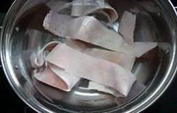 猪皮洗净放入水里煮熟,煮至用筷子插能轻巧穿过即可关火