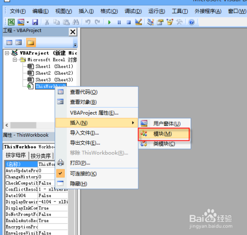 右击“Thisworkbook”,选择“插入”,选择“模块”