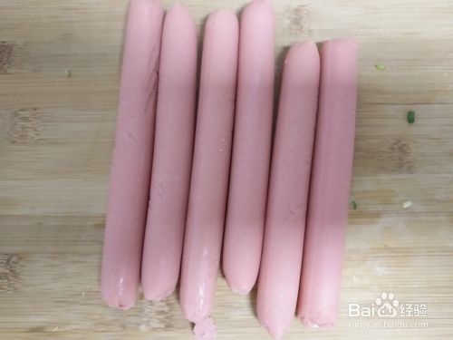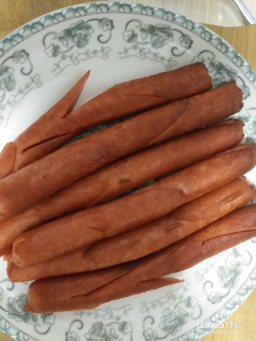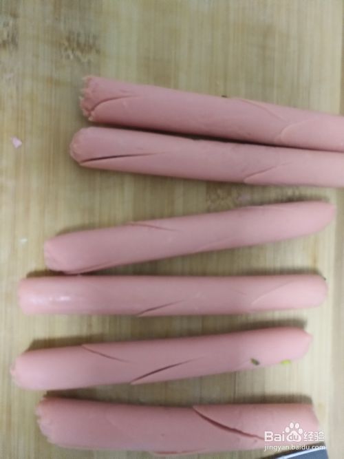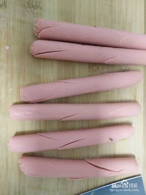 取火腿肠6根,去其外衣,用刀将每根火腿肠划上几道,成树枝状