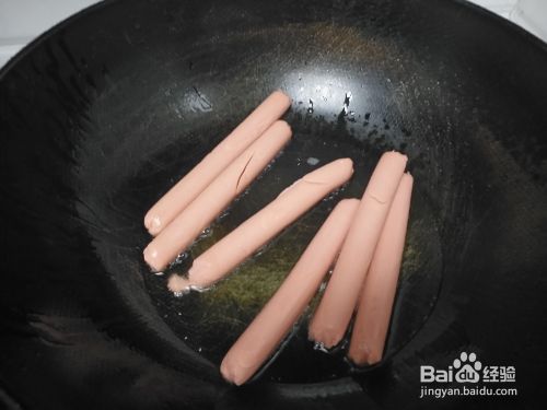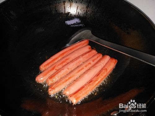 锅内加入适量食用油,加入备好的火腿肠,放入油锅内煎至金黄色后,盛入盘子中