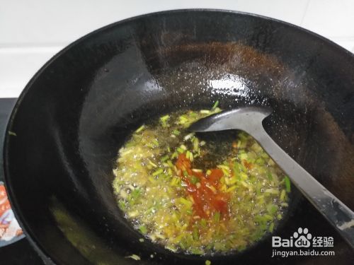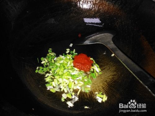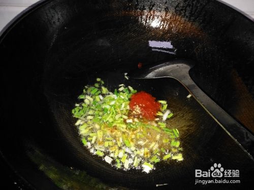 油仍在锅内,此时开大火,将切好的葱花(取一大半,另一小半留到最后)、大蒜子均放入油锅之中,即刻加入适量的生姜粉和辣椒酱爆炒