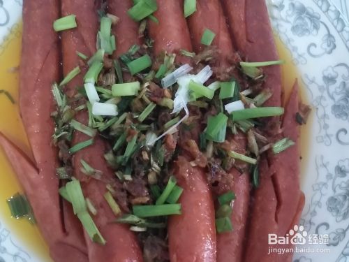 爆炒出香味后,直接倒入盘中的火腿肠上,将剩下的一小半葱花均匀撒在火腿肠之上,此时美味的油炸火腿肠就做好了,不但卫生,成本低,而且,比起小摊上的火腿肠味道更加丰富美味,有了这个油炸火腿的办法,何苦还要去小摊上花费呢?赶紧跟着小编制作起来吧,不但可以作为小吃,还可以作为一道菜哦