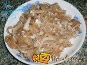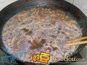 720~30分钟后,将肉、肉皮捞出切细长条。如果之前肉皮上的毛还未弄干净,此时可做进一步的处理。