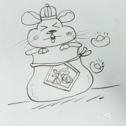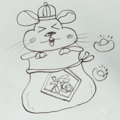 第四步,我们来画卡通老鼠的身下的钱袋子,上面还写着大元宝。