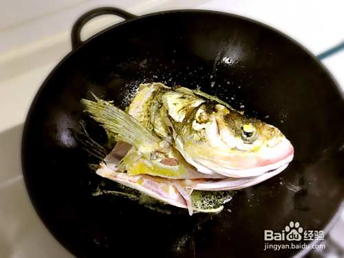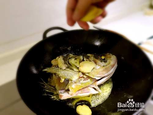 待锅中油热后,放鱼头两面煎至金黄 煎鱼三步火候:大火把油温加热;转小火,放入鱼;鱼放入后,煎的时候调中火 PS:鱼一定要多煎一会,煎至金黄,这是保持鱼汤白色的重要步骤之一