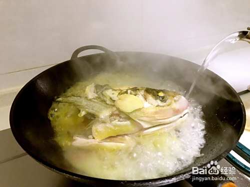 爆出香味后,加入开水 一定要加入开水,别用凉水或温水,这也是鱼汤呈白色的重要步骤之一