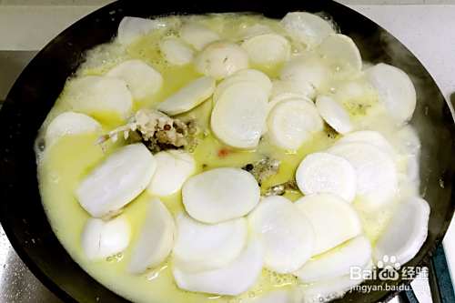 待锅中水收干,仅没到鱼头一半时,加入切片的萝卜,继续大火炖煮