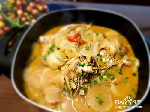 往煮沸的汤中加入葱结,提香;花椒,去腥