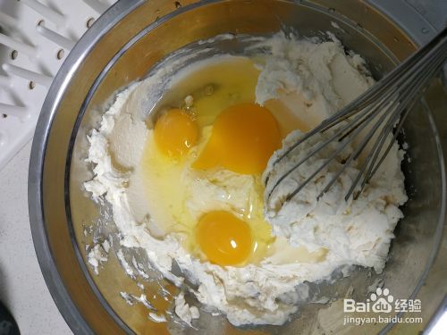 马斯卡邦尼奶酪和鸡蛋、白糖一起搅拌均匀,奶酪这里不是一定加的,可以用牛奶来代替,这里加的目的主要为了耗用烘焙原料。
