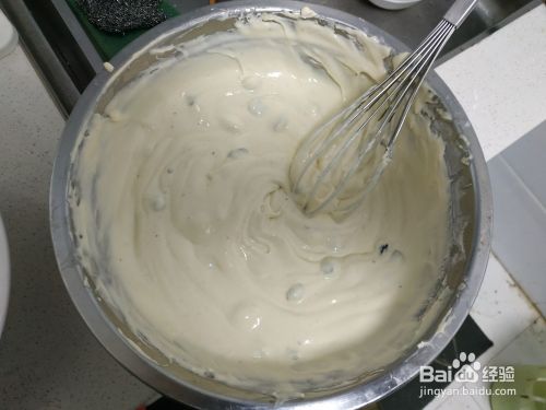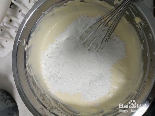 加入适量的过筛后的低筋粉到鸡蛋糊中,用蛋抽子搅拌均匀,注意不要有面块,一定要混均匀了。